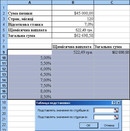Обчислити вказані величини можна, використавши таблицю підстановки з одним входом. Для цього спочатку потрібно скласти таблицю даних і у відповідні комірки таблиці введіть параметри: сума позики, строк погашення позики (у місяцях), відсоткова ставка (наприклад, 7%), щомісячні виплати і загальна сума, задавши потрібний формат комірок.