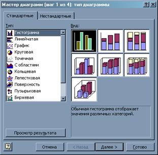 Всього в Excel є 14 типів стандартних діаграм (вкладка Стандартные), а також 20 типів нестандартних діаграм (вкладка Нестандартные). Попередньо переглянути майбутню діаграму можна, клацнувши по кнопці Просмотр результатов. За замовчуванням встановлений тип Гистограмма.