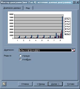 У другому діалозі майстра на вкладці Диапазон данных зазначається діапазон комірок із даними для побудови діаграми. У разі потреби цей діапазон корегується.