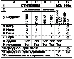 стипендия=ЕСЛИ(двоечник; 0; ЕСЛИ(троечник; 1; ЕСЛИ(хорошист; 2; иначе 3)))•МЗ