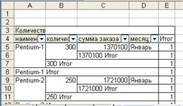 - Поместите в область страниц поле данных Месяц – (зацепите мышкой кнопку Месяц и совместите с областью Страница), а в область строк – поля Наименование товара, Количество и Сумма заказа.