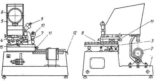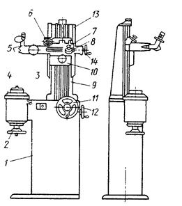 Прибор позволяет также устанавливать диаметральную координату по индикатору. Устройство имеет три исполнения с отсчетными микроскопами и с отсчетными навесными устройствами. Состоит из литого основания /, в котором размещены шпиндель 4 и механизм грубого // и точного 12 перемещений вертикальной каретки. Фиксатор 3 исключает поворот шпинделя 4 во время затяжки инструмента маховиком 2. На верхней плоскости основания крепится стойка 9 с вертикальной 10 и горизонтальной 8 каретками. Вертикальная каретка перемещается по прямоугольным направляющим посредством ходового винта с шагом 4 мм. На вертикальной каретке находятся также прямоугольные направляющие, по которым перемещается горизонтальная каретка. Горизонтальная каретка предназначена для проверки и установки размера по диаметру. На горизонтальной каретке закреплено визирное устройство с микроскопом М-125, предназначенное для фиксации положения настраиваемого инструмента на заданный размер как по диаметру, так и по вылету. Шкала горизонтального размера визирующего устройства также закреплена на горизонтальной каретке и снабжена индикатором 1-МИГ. Перемещение горизонтальной каретки осуществляется маховиком 14 посредством ходового винта с шагом 2 мм.