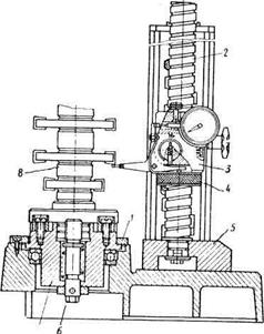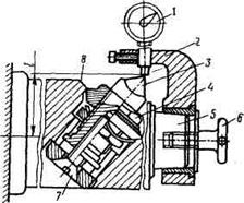 Установить оправку 8 с фрезами вертикально с центрированием по цилиндрическому буртику и двум торцовым шпонкам и закрепить винтом 6; установить на направляющей 2 индикаторную головку 3, зафиксировав положение гайкой 4; измерительным наконечником с шаровой измерительной поверхностью проконтролировать биение режущих кромок и расстояние от базового торца. Точность настройки— 0,02 ...0,03 мм при использовании индикатора с ценой деления 0,01 мм.