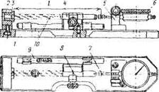 Настройка прибора осуществляется следующим образом. Маховиком грубого перемещения // перемещают вертикальную каретку до отметки 100, ориентируясь по шкале линейки 13, устанавливают лимб микроскопа 5, поворачивая его против риски-указателя с отметкой «0». Линия, находящаяся на подвижной шкале микроскопа, должна при этом занять положение между двумя параллельными линиями, видимыми в окуляр микроскопа (рис.6). Маховиком 14 (см. рис.5) перемещают горизонтальную каретку в положение, когда отметка с цифрой 0 шкалы 0—10 микроскопа 7 модели МОС-21 совместится с цифрой 0 шкалы линейки горизонтального отсчета (рис.6). Поворачивая лимб микроскопа МОС-21, устанавливают подвижную шкалу микроскопа отметкой 0 против риски указателя. Отметки с цифрами от 0 до 10 шкалы 0—10 микроскопа МОС-21 должны находиться в промежутке между двумя дуговыми концентричными линиями, видимыми в окуляр микроскопа.