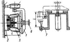 Прибор для предварительной настройки расточной борштанги показан на рис.7. Стержень индикатора 1 прибора предварительно настраивают по эталону на длину l вылета резца 3; прибор устанавливают на хвостовик оправки 5 закрепляют винтом 6. Регулировочной гайкой 4 выставляют резец 3 на требуемый размер (по индикатору 1), после чего закрепляют резец винтом 7.Пподналадку в процессе эксплуатации выполняют регулировочной гайкой 4 относительно риски 8 на корпусе. Точность настройка — 0,02 мм при использовании индикатора с ценой деления 0,01 мм; время настройки — 3,5 мин.