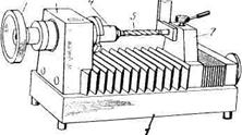 Прибор для размерной настройки инструмента мод. 2010 показан на рис.3. Прибор предназначен для предварительной установки в двух горизонтальных координатах как резцов в инструментальных блоках станков токарной группы, так и вращающегося инструмента в оправках и на борштангах станков сверлильной и расточной группы. Прибор состоит из ступенчатой станины 1, на плоскости нижней ступени которой имеются Т-образные пазы для установки переходников-адаптеров (имитирующих базирующие поверхности станков токарной группы для установки инструментальных блоков), или шпиндельной бабки 2 для установки борштанг. На верхней поверхности станины находятся нижняя 3 и верхняя 4 каретки, перемещающиеся соответственно в продольном и поперечном направлениях. На верхней каретке установлено визирное устройство 5, выполненное в виде проекционного микроскопа. На поворотном экране 6 проектора имеется штриховое перекрестие.
