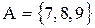 и прочитать как : “А- множество, содержащее 7, 8, 9”.