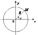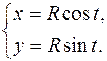 В качестве примера установим параметрические уравнения окружности радиуса R с центром в начале координат. Пусть M(x,y) – текущая точка окружности, а t – угол между радиус-вектором этой точки и осью Ox, отсчитываемый в положительном направлении. Вспоминая определение синуса и косинуса произвольного угла, нетрудно получить