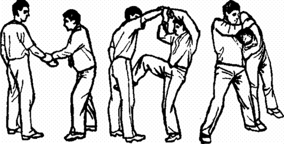1.Шагнув вперёд, захватить двумя руками руку противника за запястье так, чтобы одноимённая рука была ближе к кисти захваченной руки, и нанести удар ногой в пах или по другим зонам и точкам активного поражения.