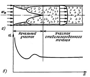 | Рис. 9.4. Образование пограничного слоя (а) и распределение местного коэффициента теплоотдачи (б) при турбулентном течении теплоносителя внутри трубы |