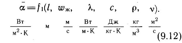 Основная трудность, возникающая при экспериментальном исследовании конвективного теплообмена, заключается в том, что коэффициент теплоотдачи зависит от многих параметров. Например, средний по поверхности коэффициент теплоотдачи от продольно омываемой пластины (см. рис. 9.2) зависит от длины пластины l, скорости набегающего потока wж и теплофизических параметров жидкости: