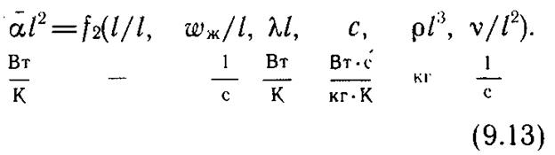 Число параметров в правой части уравнения уменьшилось, так как l/l==1, т. е. мы избавились от того параметра, который приняли за единицу измерения. Если теперь ввести еще три «новых» единицы измерения: для времени l 2/v, для массы рl 3 и, наконец, для отношения тепловой мощности к перепаду температур λl (в рассматриваемой системе величин единицы Вт и К раздельно не встречаются, а входят лишь в комбинации Вт/К), то в правой части рассматриваемой зависимости останется всего два безразмерных параметра: