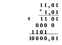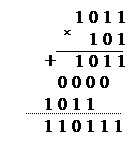 Для умножения одного числа на другое необходимо перемножить каждую цифру второго числа на первое число, начиная с последней цифры второго числа. Записывать умножение необходимо в столбик аналогично умножению в десятичной системе. Затем результаты умножения сложить.