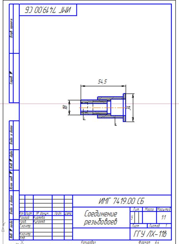 Цель лабораторной работы:освоение правил выполнения и оформления сборочных чертежей, содержащих резьбовое соединение; приобретение навыков и умений построения чертежей резьбовых деталей и соединений.
