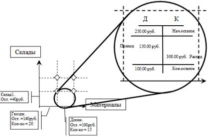 Многомерный аналитический учет в «1С:Предприятие 8» строится с использованием так называемых субконто. Под субконто в «1С:Предприятие 8» понимается минимальная единица многомерного аналитического учета. Почему субконто? Обратимся еще раз к схеме многомерного аналитического учета, и рассмотрим «укрупненно» одну из ячеек, представленных на рис. 1-10. Говоря о бухгалтерском учете, мы не можем просто сказать, что на пересечении «склада №1» и «досок» находится 15 единиц на 100.00 руб. Дело в том, что нам еще необходимо знать, что это за цифры: остаток на начало дня, остаток на конец месяца, приход за неделю, расход за квартал?