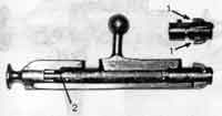 Фото 1. Винтовка образца 1891-1930 гг. Ее официальное название - винтовка Мосина-Нагана образца 1891 года. Но в реальной конструкции оружия от Нагана осталась только фамилия этого бесспорно талантливого оружейника. Его очень удачный математический компоновочно-балансовый расчет гениально воплощен в металл русским артиллерийским офицером С.И. Мосиным. Капитан Мосин поставил себе задачу - создать оружие для практического применения в тяжелейших условиях различных климатических зон Российской империи, способное выдержать варварскую эксплуатацию в грязи окопов и песке, постоянно падающем на войне сверху вниз. Мосин достиг цели. Он заложил в свою винтовку концептуально новые принципы работы частей, узлов и механизмов. Геометрический профиль деталей оружия и система их взаимодействия были тщательно продуманы, опробованы в самых жестоких условиях, и только по результатам испытаний принимались единственно правильные конструктивные решения. В конструкцию винтовки была внесена принципиально новая деталь - отсечка-отражатель, сделавшая систему практически безотказной. Лишних деталей в этом оружии не было. Винтовка не ломалась - ломаться в ней было нечему. Более того, она легко разбиралась и собиралась, что было очень важным при ее освоении молодыми солдатами, набранными из полуграмотного крестьянства тогдашней России. Система, представленная на оружейный конкурс в 1891 году, не была винтовкой Нагана. Это была винтовка Мосина. Ее калибр измерялся в старой дюймовой системе и равнялся трем линиям (одна линия равна 2,54 мм). И поэтому, несмотря на казенные наименования модификаций различного времени выпуска, для населения России она так и осталась трехлинейной винтовкой. Так ее называют уже более ста лет. Принцип действия этого оружия основан на работе поворотного затвора (фото 2), продольно скользящего в ствольной коробке (7 на фото 3). При досылании затвора вперед он подхватывает патрон из магазинной коробки, выталкивает его за пределы воздействия отсечки-отражателя (7 на фото 4), которая . не дает патрону "вывалиться" вертикально вверх, и по направляющим пазам ствольной коробки подает патрон в патронник. При повороте рукоятки затвора вправо боевые выступы боевой личинки (7 на фото 2) поворачиваются на 90° и заходят за боевые выступы ствольной коробки. Таким образом, происходит запирание системы (схемы 1, 2, 3). При нажиме на спусковой крючок (7 на фото 5, 6) опускается шептало (2 на фото 5, 6), с которого срывается курок (3 на фото 5), ударник разбивает капсюль, происходит выстрел. При повороте рукоятки затвора вверх боевые выступы личинки и ствольной коробки выходят из взаимного зацепления, система отпирается, курок взводится взаимодействием его винтовой червячной геометрии с аналогичной винтовой геометрией торца стебля затвора (2 на фото 2). Таким образом, курок открытого затвора всегда будет взведен. При отведении затвора назад зацеп-выбрасыватель, запрессованный в боевой личинке, извлекает из патронника стреляную гильзу. Геометрия открытого затвора образует паз-желобок (7 на фото 7), которым затвор при движении назад скользит по зубу отсечки-отражателя (2 на фото 4). Извлекаемая гильза "наезжает" на этот зуб, отражается от него и выбрасывается в сторону зацепа наружу. Для заряжания оружия надо открыть затвор, вставить в специальные пазы ствольной коро