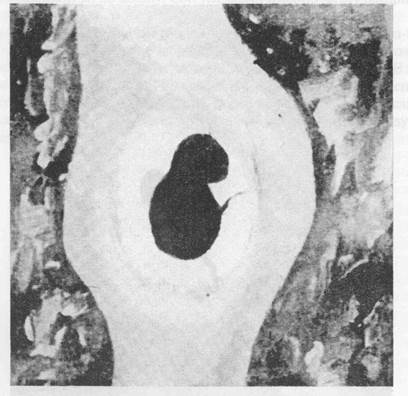 Несколько месяцев тому назад она создала ряд рисунков, исполненных художественного вдохновения, однако, из спонтанности рисунков проступало наличие в данный момент опухоли, разрушающей целостность клетки (рис. 12/А и 12/Б). Впрочем, для нее самой эти рисунки имели другое значение. В ее последних работах сохранились следы первых рисунков, но уже в ином виде. Первый рисунок (рис. 12/А) изображает белого кита с черным пятном внутри. Я спросил у нее, что означа-