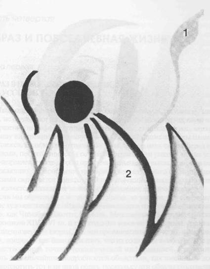 На другом рисунке, одном из последних (рис. 12/Ж), опухоль отторгается: тело женщины изгоняет болезнь. Таким образом, раскрывается сама жизнь, исчезает экзистенциальная ригидность, которая лежит в основе заболевания субъекта. Достаточно прекратить сопротивление, чтобы болезнь исчезла, так как сама жизнь изначально здорова. Болезнь всегда указывает на наличие надстройки. Таким образом, мы видим на рисунке раскрытие, выход, освобождение. Голубой цвет (1), который появляется на том же рисунке, выражает ее эфирное поле, кроме того, начинает проявляться и творческий элемент, представленный желтым цветом (2). Освобождаясь от болезни, необходимо активизировать онто Ин-се.
