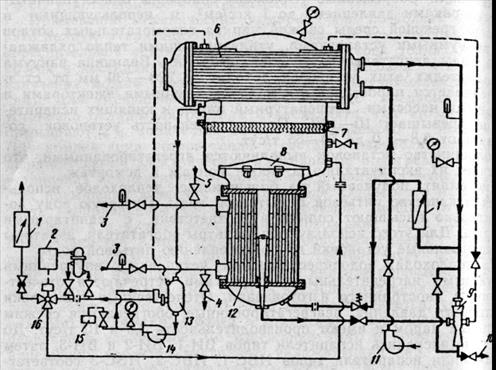 Корпус из нержавеющей стали. Трубки мельхиоровые. Трубные доски латунные. Трубки приварены к трубным доскам. Отбойник8, сепаратор жалюзийного типа 7, солемер 2, электромагнитный трехходовой клапан 16. Вакуум и удаление рассола производится эжектором 5. Питание испарителя 12 забортной водой производится насосом 11. Пар, полученный в испарителе 12, проходит через сепаратор отбойного типа 8 жалюзийного типа 7, осушается, конденсируется в конденсаторе 6. Дистиллят стекает в сборный бачок 13и удаляется насосом 14через солемер 2, расходомер 1в сборную цистерну.
