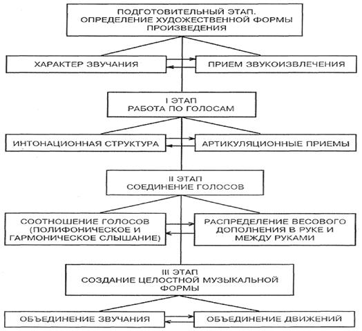Схема работы над произведением и принцип укрупнения осваиваются ребенком постепенно. В результате изучения первой темы "Ритм" ученик приобретает способность создавать гармонию слуховых и двигательных представлений при извлечении одного звука, а также начинает мысленно организовывать звуки в пространстве и во времени (это соответствует подготовительному этапу на схеме и первым двум ступеням принципа укрупнения).