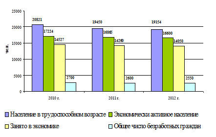 Рисунок 1 – Динамика экономической активности, занятости и безработицы по городу Оренбургу в среднегодовом исчислении за 2012-2014 гг. (чел.).