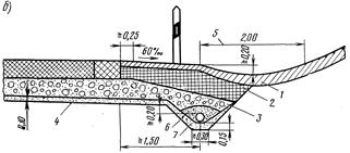 Рис. 27.24. Схемы отвода воды от автомобильных магистралей: а и б – мелкие лотки около невысоких насыпей; в – трапецеидальная канава в выемке; г – подземный водосток; 1 – растительный грунт с одерновкой; 2 – местный грунт; 3 – морозозащитный слой; 4 – фильтрующий слой (в отдельных случаях); 5 – одернованный лоток; 6 – гравийный фильтр; 7 – дренажная трубка;