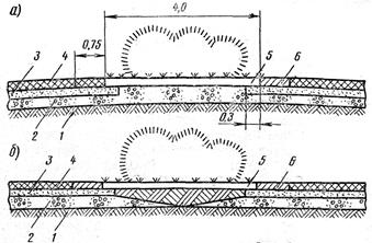 На участках магистралей, расположенных в нулевых отметках, грунт основания должен быть уплотнен на толщину не менее 50 см, так как опыт эксплуатации выявил частые случаи просадок покрытий на таких участках. В выемках верхний слой грунта также заменяют морозоустойчивым.