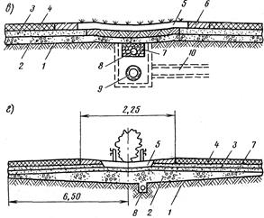 Верхнюю часть противопучинного слоя под разделительной полосой устраивают из уплотненного гравелистого грунта, пригодного для роста растений, поверх которого укладывают слой растительного грунта (рис. 27.28а). Иногда траншею для дренажных труб и вогнутую часть поверхности земляного полотна выстилают водонепроницаемой полиэтиленовой пленкой. Описанная конструкция отвода воды с разделительной полосы вполне оправдала себя в ряде западноевропейских стран и отражена в их технических условиях.
