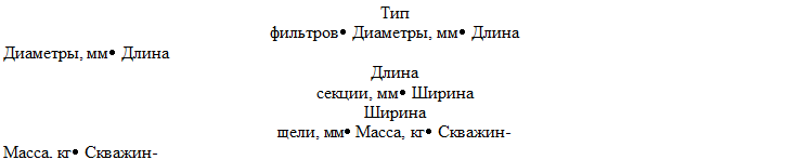 EMBED Microsoft Equation 3.0 , м/сут (1.20) где d50, Д50 - соответственно 50%-ный диаметр частиц водоносной породы и зерен обсыпки фильтрующей колонны, мм.В последние годы в Белоруссии успешно внедряются удовлетворяющие перечисленным выше требованиям кольцевые полимерные фильтры, изготовленные из термопластичных материалов (полипропилен и полиэтилен). Конструктивные параметры таких фильтров, изготовляемых путем набора на стальные стержни колец с продольными щелями клиновидного поперечного сечения, сужающихся в направлении внутрь фильтра, приведены в таблице 10.4.