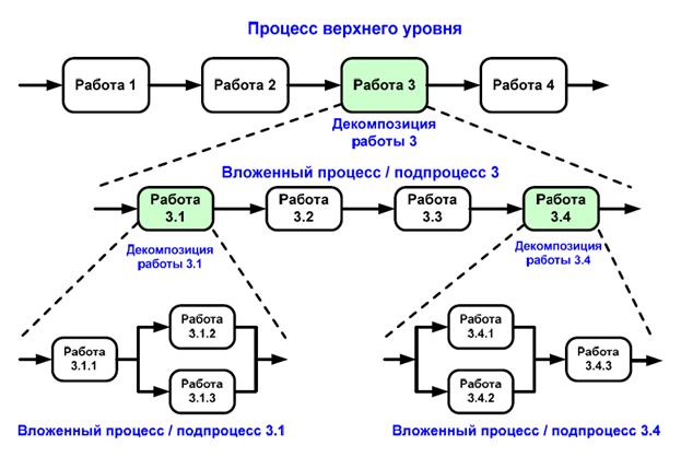 В случае необходимости работы на схеме процесс а второго уровня могут быть декомпозированы на схемы бизнес-процессов третьего уровня и т.д. Декомпозиция бизнес-процесса должна продолжаться до тех пор, пока не будут достигнуты цели его описания. В данном случае удобно использовать понятия вложенный процесс или подпроцесс. На рисунке 3.9 процессная схема работы 3 является вложенным процессом или подпроцессом процесса верхнего уровня. Аналогичным образом процессные схемы работ 3.1 и 3.4 являются вложенными процессами или подпроцессами процесса второго уровня.