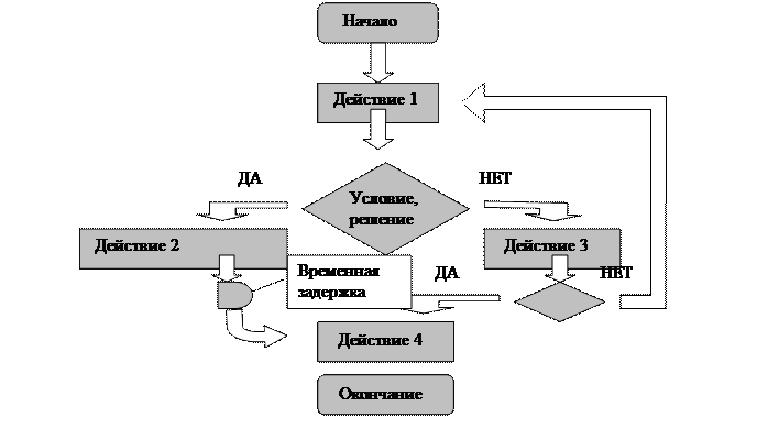 При описании бизнес-процессов нижнего уровня используются немного другие процессные схемы, под названием WFD - Work Flow Diagram, что переводится как диаграмма потоков работ. На этой схеме появляются дополнительные объекты, с помощью которых описывается процесс: логические операторы, события начала и окончания процесса, а также элементы, показывающие временные задержки (Рисунок 3.6).