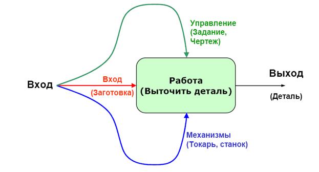Давайте рассмотрим пример бизнес-процесса «Выточить деталь», который выполняет токарь. Входом процесса является заготовка из которой вытачивается деталь - она физически преобразуется в процессе. Для того, что бы токарь начал точить деталь ему нужно дать задание или план. Также ему понадобится чертеж с размерами детали. Так вот, чертеж, задание или план нужны для реализации бизнес-процесса и процесс без них не начнется, но по ходу выполнения процесса они не преобразуются. Согласно стандарту IDEF0 их относят к управлению. Для того, что бы выточить деталь нужен токарь, нужен станок - их относят к механизмам. Выходами или результатами бизнес-процесса является деталь (Рисунок 3.7).