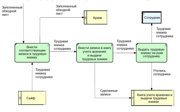 Рисунок 3.8 – DFD-схема бизнес-процесса «Оформление и выдача трудовой книжки сотруднику при увольнении» в нотации Гейна-Сарсонса
