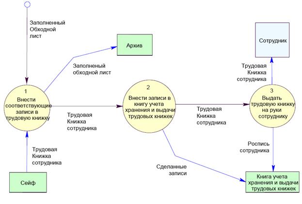 На данной схеме в качестве хранилища данных выступают сейф, в котором хранятся трудовые книжки и архив, в который помещается заполненный обходной лист. В качестве внешней сущности выступает сотрудник, который увольняется и который получает выход рассматриваемого бизнес-процесса - трудовую книжку.