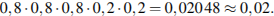 Поскольку биатлонист попадает в мишени с вероятностью 0,8, он промахивается с вероятностью 1 − 0,8 = 0,2. Cобытия попасть или промахнуться при каждом выстреле независимы, вероятность произведения независимых событий равна произведению их вероятностей. Тем самым, вероятность события «попал, попал, попал, промахнулся, промахнулся» равна