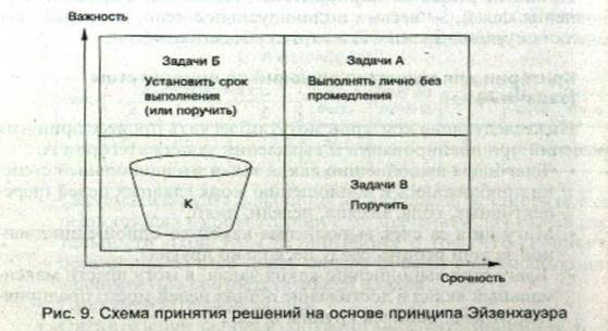 Предложенное американским генералом Дуайтом Эйзенхауэром правило является простым вспомогательным средством, особенно для тех случаев, когда надо быстро принять решение относительно того, какой задаче отдать предпочтение. Согласно этому правилу (рис. 9) приоритеты устанавливаются по таким критериям, как срочность и важность дела.