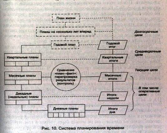 Систему планирования личного труда руководителя можно представить как закрытую систему, в которой отчетливо видны взаимосвязи между отдельными видами планов — долгосрочные планы конкретизируются в соответствующих средне- и краткосрочных, а также в планах текущего периода. Последние воплощаются в планах дня (рис. 10).