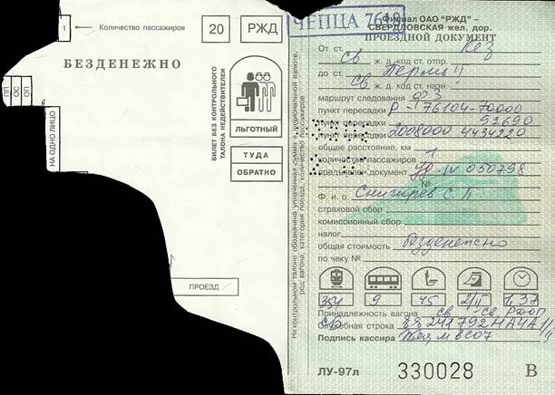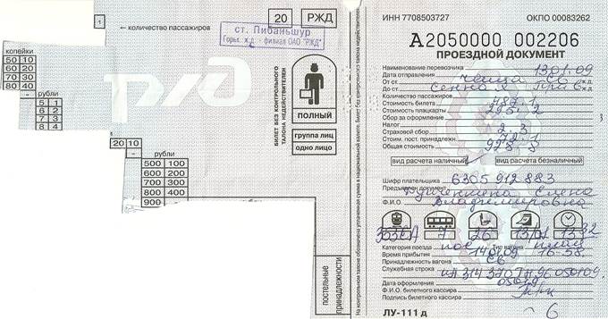 Номер документа пассажира, предъявленного при оформлении проездного документа, фамилия и инициалы пассажира. При этом если пассажиру выдан безденежный или льготный проездной документ, то эта строка будет начинаться с серии и номера документа, дающего право на льготу или бесплатный проезд.
