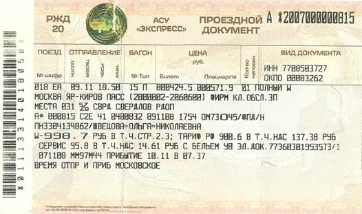 Заключение договора перевозки между пассажиром и перевозчиком удостоверяется проездным документом (билетом). Проездной документ – документ установленной формы, где указываются наименование, номер и серия документа, наименование станции и дороги отправления, станции и дороги назначения, число пассажиров, стоимость, срок годности билета, номер поезда, номер и тип вагона, номер места, время прибытия и отправления поезда.
