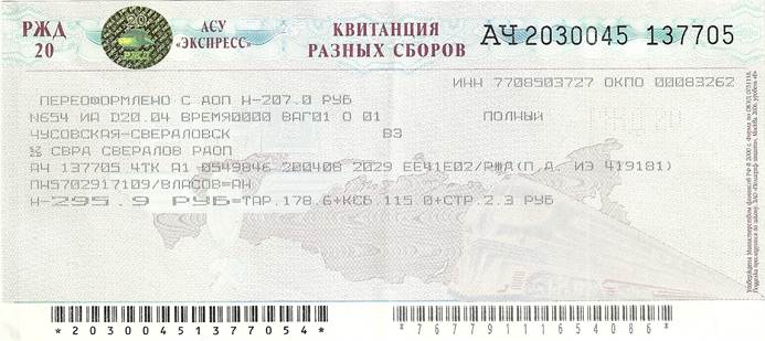 Квитанции разных сборов, оформленные в кассе, права проезда не дают. При оформлении различного рода доплат начальником поезда по квитанциям формы РС-97 пассажир имеет право следовать по маршруту указанному на квитанции.
