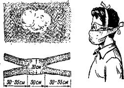 Ватно-марлевая повязка изготовляется из куска марли размером 100x50 см. На его середину кладется слой ваты размером 30X20 и толщиной 1—2 см; марлю с обеих сторон загибают, закрывая ею вату. Концы марли надрезают так, чтобы образовались две пары завязок.