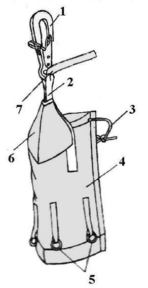 Форма цилиндрическая. Материал – капроновый авизент. Состоит из осно-вы (4) и имеющихся на ней: в верхней части – карабин(1) для крепления к тросу или удлинителю в самолете, ленту зачековки (7) для зачековки резиновой соты, предохранитель (6), шнур-завязку (3)для стягивания камеры; в нижней – металлические кольца (5)для контровки с кольцами стабилизатора.