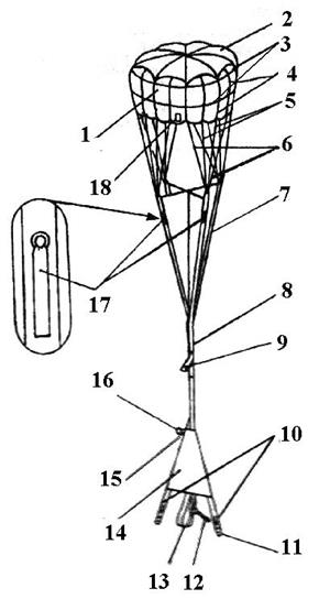 - распределитель сот (8)с резиной сот (9) из ранцевого шнура для удержания строп в сотах;