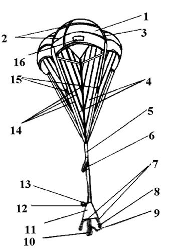 Состоит из основы купола и строп. Основа купола состоит из 24 клиньев (1), которые образуют неплоский круг площадью 100 м2. Каждый клин купола в свою очередь состоит из семи клиньев, шесть из которых изготовлены из капроновой ткани, и один клин (2) шириной 50 мм – из ткани "эксцельсиор", являющейся сеткой. Клинья соединены между собой швом «в замок». На швы, соединяющие клинья купола, настрочены капроновые ленты ЛТКП-13-70. Нижняя кромка купола усилена с двух сторон капроновой лентой ЛТКП-15-185. По нижней кромке купола у всех строп, кроме строп № 1А,1Б,13А,13Б, нашиты перемычки из капроновой ленты ЛТКП-15-185, которые предназначены для предотвращения случаев перехлестывания купола стропами и уменьшения времени его наполнения. На основе купола, между стропами № 1А и 1Б,13А и 13Б имеются щели (3)длиной 1,7 м, предназначенные для разворота купола при снижении.