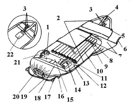- клапан (15)с двумя парами люверсов (14)для пропуска съемных резиновых сот (16, 17)и с двумя карманами (21)для прикрытия пучков строп; для удобства укладки строп на клапане около люверсов нанесена маркировка – 1,2,3,4;