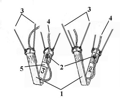 Свободные концы замаркированы циф-рами: 1 и 2 – правая пара, 3 и 4 – левая и заканчиваются пряжками-полукольцами, к которым крепятся стропы основного парашюта. На свободных концах, замар-кированных цифрами 2 и 3, имеются ре-зиновые шлевки из эластичной ленты, предназначенные для заправки слабины строп управления. В верхней части сво-бодных концов нашиты четыре ленты с кольцами, через которые пропущены стропы управления.