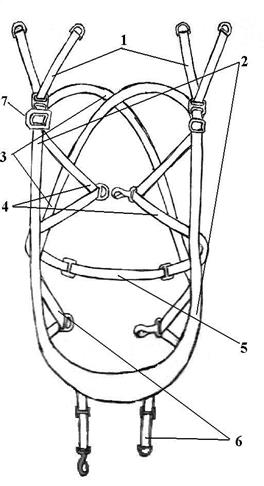 Грудная перемычка образована наспинно-плечевыми обхватами, идущими вверх от крестовины через изогнутые пряжки, и имеет в левой половине карабин, а в правой – пряжку.