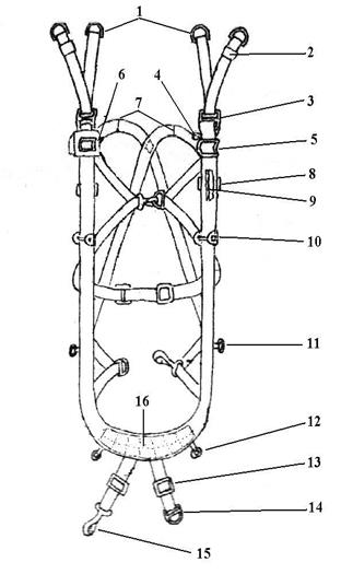 Образовавшийся из лент треугольник с обеих сторон закрыт косынками (14), изготовленными из капронового авизента. На силовые ленты между косынками с помощью ленты (15)ЛТКкрП-26-600 нашито направляющее кольцо (16), через которое пропускается шнур включения парашютного прибора. На силовых лентах около пряжек черной безвредной краской нанесены стрелки для контроля правильности монтажа и установки силовых лент на двухконусный замок.