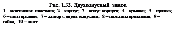 Двухконусный замок (рис. 1.33) предназначен для удержания пряжек силовых лент стабилизирующей системы во время стабилизации и освобождения их при выдергивании звена ручного раскрытия или срабатывании парашютного прибора.В состав двухконусного замка входят следующие части: