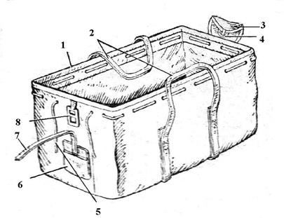 Ранец изготовлен из капронового авизента или капроновой ткани и состоит из основы, накладного дна, правого и левого клапанов. Между основным и накладным дном вставлена рама жесткости.